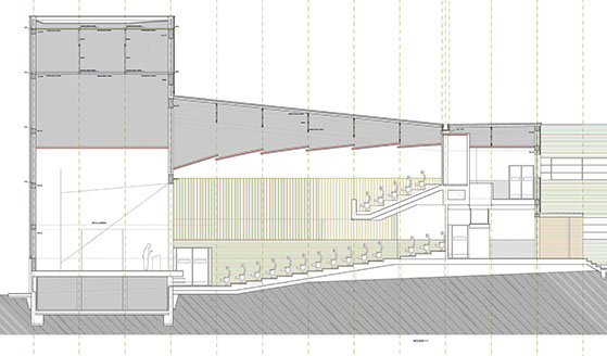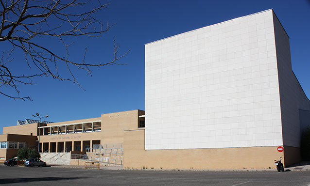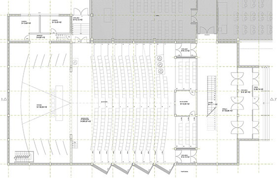 Este proyecto partía de la pretensión de realizar un auditorio, que sirviera tanto para salón de actos del colegio donde celebrar graduaciones, aperturas de curso, actuaciones musicales o teatrales de uso interno, como para auditorio o teatro de uso externo por organizaciones públicas o privadas, que pudieran desarrollar usos diversos, desde congresos a conciertos musicales. Se partía de un presupuesto muy ajustado y de unas necesidades acústicas elevadas, que dieran buena respuesta a todas las actividades mencionadas. El diseño interior estaba condicionado por estas premisas, añadiendo que al ser sus usuarios principales los estudiantes del colegio, es decir niños, tanto el mobiliario como las zonas bajas de las paredes debían ser especialmente resistentes al uso y al roce. El resultado final es un auditorio polifuncional, de apariencia noble a la par que moderna, con unos valores acústicos muy ajustados y unos materiales muy resistentes entre los que se encontraban el granito, algunas especies de maderas especialmente tratadas y el acero.