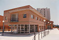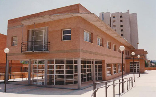 En este proyecto se generó una plataforma horizontal en el centro del solar para absorber el desnivel de la calle. Sobre ella se posa un edificio separado de las medianeras con dos cuerpos diferenciados, uno rectangular de dos alturas y de desarrollo longitudinal, y otro con forma curva que enmarca el fondo del edificio. El acceso a la plataforma se realiza mediante escalinatas y rampas que permiten un recorrido secuencial con diferentes perspectivas del inmueble. Se proyectó una composición volumétrica equilibrada entre el sobrio y racional paralelepípedo que alberga las oficinas, y el volumen más orgánico destinado a salón de actos. Al primero se le practicó un juego de volúmenes añadidos y restados que le daban una apariencia menos rígida al conjunto, como se observa en el porche del extremo y en el cuerpo de acceso. Con la composición lineal de huecos y el aparejo de ladrillo se contribuyó a potenciar el sentido longitudinal del edificio. El cuerpo del salón de actos situado al fondo del conjunto, tiene una proporción trapezoidal en su planta. Sobre la base menor se encuentra el escenario, mientras que el lado opuesto de mayor dimensión y trazado curvo, se descompuso en un juego de luces y sombras mediante esbeltas pantallas de ladrillo acentuando la focalidad radial de la planta del salón de actos.