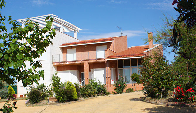 En esta actuación se proyectó un edificio aislado distribuido en dos alturas sobre la rasante del terreno. La planta baja se dedicó a zona de uso diurno y la planta primera a zona de noche. También se proyectó un semisótano con acceso desde el interior de la vivienda como espacio de desahogo. La conexión entre las plantas del edificio se realiza por un núcleo de escaleras dispuesto en su centro. Se buscó un juego de volúmenes que representara la adaptación del inmueble al terreno inclinado, que identificara las diferentes zonas y usos de la vivienda y que le diera una impronta exclusiva que la diferenciara de las otras edificaciones unifamiliares del entorno. Para ello se dispusieron una serie de prismas maclados unos con otros, rematándose con cubiertas inclinadas o planas en función del uso desarrollado en su interior. Los materiales y texturas empleados favorecen la lectura y entendimiento de todo el conjunto: se utilizó fábrica de ladrillo cara vista en tonos rojos en la mayoría de la vivienda, y aplacado de piedra natural tipo Bateig para el cuerpo prismático del extremo, que acentuaba su carácter monolítico, convirtiéndolo en elemento de remate del conjunto y referencia en la zona.