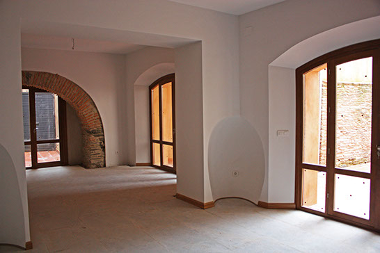 Este proyecto de rehabilitación integral afecta a dos edificios medianeros, ocupados por viviendas características de la arquitectura popular de la zona de los llanos de Cáceres. Dentro de los elementos que se mantuvieron, dado el valor patrimonial e histórico del conjunto, se puede reseñar como el más destacado la chimenea de fábrica de ladrillo y pizarra, coronada por una sillar de granito labrado. Para su correcta conservación durante la obra y acabado final, se proyectó su tratamiento mediante medidas ingenieriles y de la más delicada restauración. En la intervención se mantuvo la configuración en planta de ambos edificios, liberándolos de aquellos espacios resultantes de reformas y agregaciones que dificultaban la lectura de su ordenación primigenia, respetándose la macla que generaban estos volúmenes en la esquina de contacto entre ambos. Además se mantuvo la independencia de uso de las dos viviendas, aún siendo de un mismo propietario. Esto se debe a que parte de uno de los edificios se destinó a residencia permanente de los familiares del promotor, mientras que el resto de la actuación se destina a segunda residencia, disponiendo el conjunto de más de 7 dormitorios dobles y sus respectivos baños. La disposición de los huecos se estudia detenidamente buscando el mejor ajuste a los espacios interiores a los que sirven.